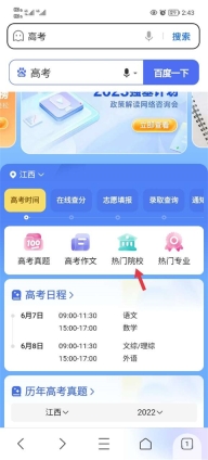 1、在百度app当中搜索靠高考,然后找到热门院校点击。