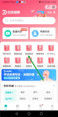 1、用户使用百度账号或手机号登录百度健康app(即百度app)进入百度健康页面后点击如下图绿色箭头所指的【疫苗服务】