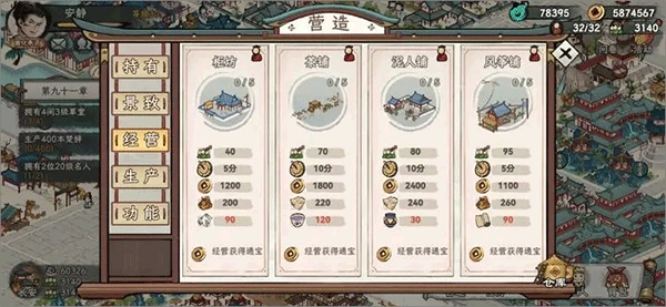 经营类建筑具备一项重要功能,它能够把玩家手头的物资变卖掉,换成通宝,进而获取利润。而这些利润又可再次投入到生产当中,如此一来,生产经营就形成了一个良性循环。具体过程为,先使用通宝来生产食物,接着以食物作为条件召集人口去生产初级产品,初级产品经过进一步深加工得到高级产品,最后高级产品通过经营类建筑的售卖重新转化为通宝。所以说,当玩家缺少通宝时,多建造几个经营类建筑通常是个不错的选择。