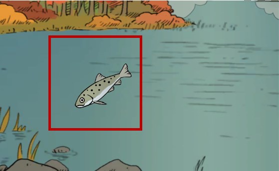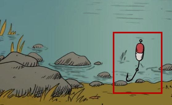 3、鱼竿制作完成之后就可以点击窗外,再点击右下角的箭头,在点击右上角的湖泊就能看到有一个鱼钩,点击就可以开始钓鱼。