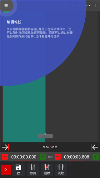 2、添加静音,删除部分音频,可对音频及编辑堆栈的任意部分进行复制粘贴,这样能让您轻松浏览编辑内容,还能方便地撤消或重做操作。