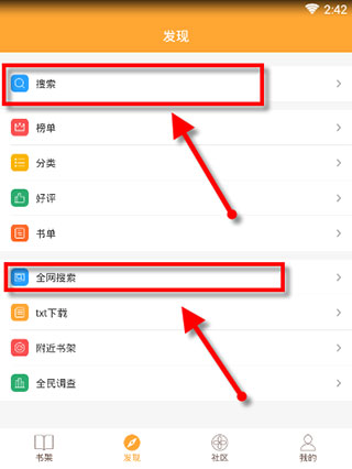 2、在发现页面,用户可在第一栏的搜索框中输入自己想看的书籍名称。倘若小书亭未能找到您所需的书籍,那就点击中间的“全网搜索”,以查找您想看的书籍。
