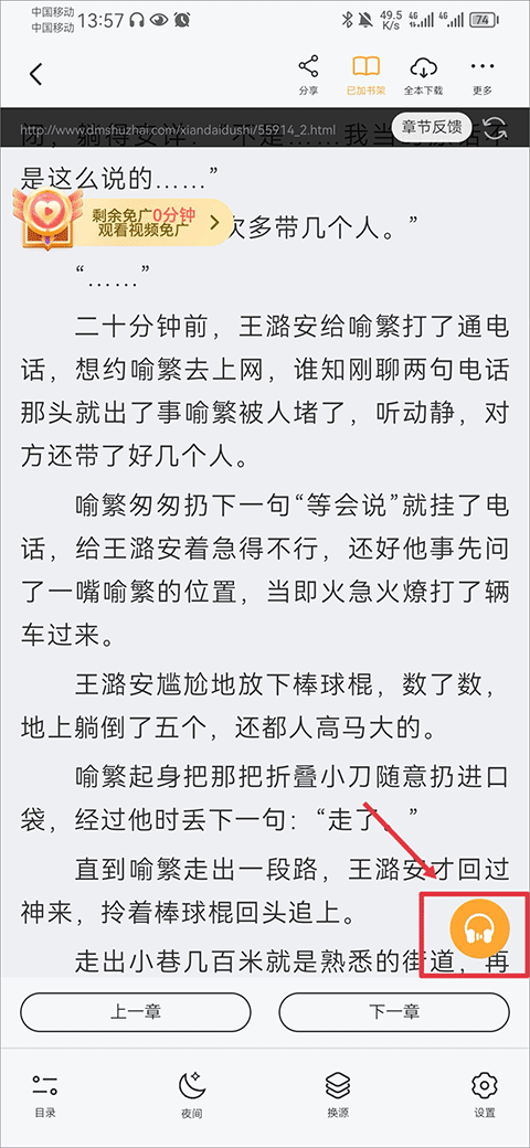 3、进入小说阅读界面后,点击屏幕唤醒阅读功能,然后点击右下角听书按钮;