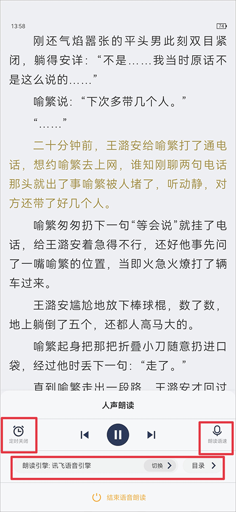 4、点击后就可以听书啦,而且用户还可以设置听书定时关闭、朗读语速、切换语音等功能。