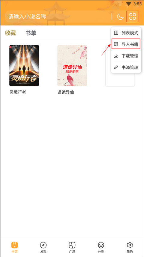 2、若仍存在,那么可利用小说导入功能来导入小说(具体操作是进入书架,点击右上角的菜单按钮,接着点击导入书籍,再选择文件夹,最后挑选要导入的小说就行)。