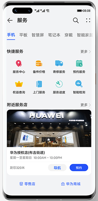一键查找附近门店、线上预约、智能检测;一站式服务就在“服务”