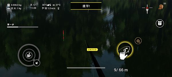 5、只需耐心等待,鱼儿便会上钩。当浮标有所动静时,可点击右下角的放大键,放大浮标以观察其动向。要是手机出现振动,那就表明有鱼咬钩了,倘若收钩过晚,鱼就会跑掉。