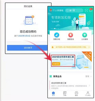 5、提交成功后,系统会显示“您已成功预约”页面。此时,纳税人能够在预约日期当天办理2021年度汇算申报。另外,纳税人也可在手机个人所得税APP首页的年度汇算专题栏查看预约情况。