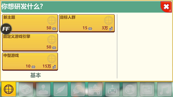 4、挑选要开发的游戏名称、主题以及平台。接着点击下一步,需留意游戏成本,投入成本不能超过所持有的金币数量。
