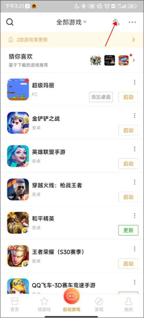 2. 在游戏启动界面的右上角找到扳手图标,然后点击,具体位置如图所示。