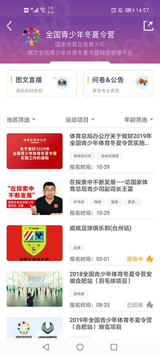 要是你对夏令营之类的活动感兴趣,在这款软件里同样能找到。软件内涵盖了各式各样的青少年体育冬夏令营,无论是足球、篮球、露营、登山,还是航模等各类体育项目的冬夏令营,都一应俱全,内容十分丰富。