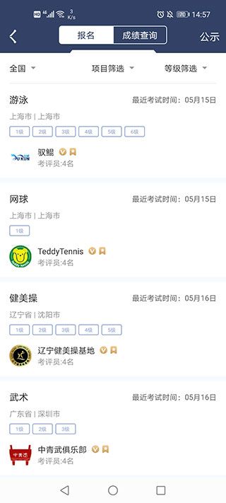 3、点击青少年等级,在此处可看到各类项目的报名考试入口,还能进行成绩查询等操作。