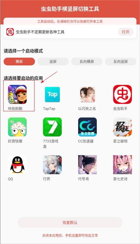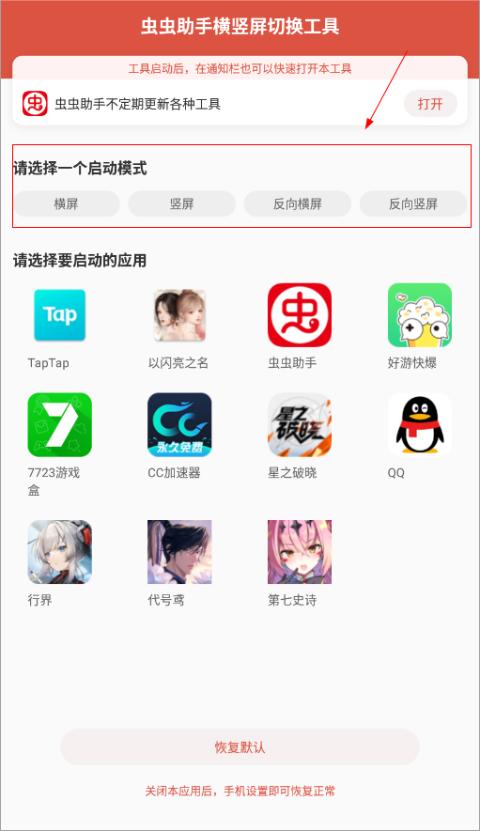 1. 下载并安装虫虫助手横屏切换工具,打开该软件后,在其中选择启动模式,此工具支持横屏、竖屏、反向横屏以及反向竖屏模式。