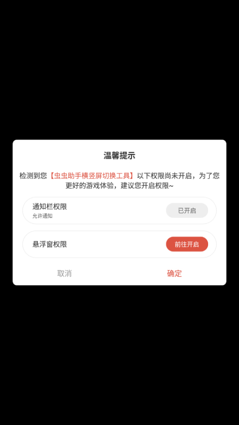 2、应用会弹出开启通知和悬浮窗权限的提示,点击“前往开启”。