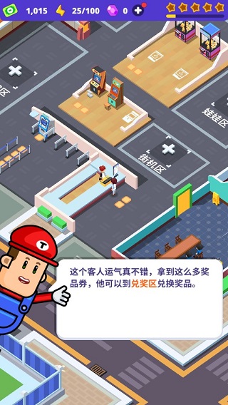 除了一些独特的单纯游戏体验外,游戏厅内还有诸多好玩的项目。瞧,这位客人运气真好,赢得了大量奖品券,此刻他能去兑奖区兑换奖品。