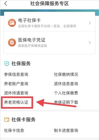 4、操作完成后,即可在打开的社会保障服务专区页面里点击【养老资格认证】。