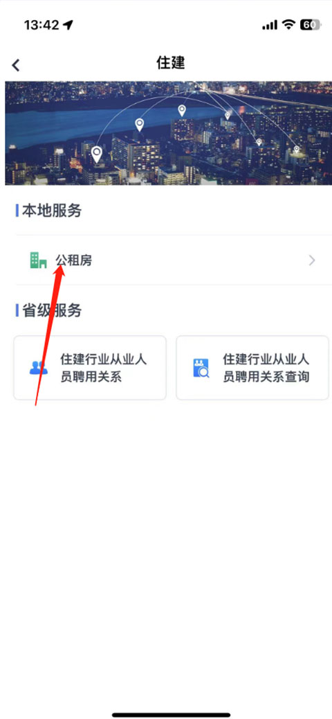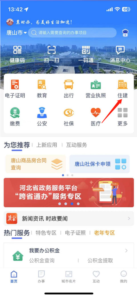 2、在首页左上角选择所在城市,并进入“住建”模块。