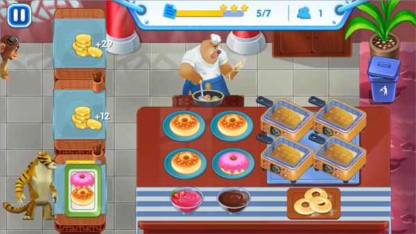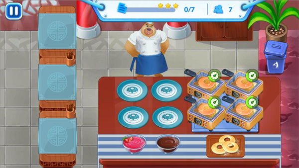2、在游戏中,你能够挑选一位厨师,初始角色为熊二。此关卡的任务是给大家熟悉的毛毛送上烤甜甜圈。游戏过程中,要留意等待时间条以及食物的烤熟时间,待食物烤好后,装盘送给毛毛享用即可。
