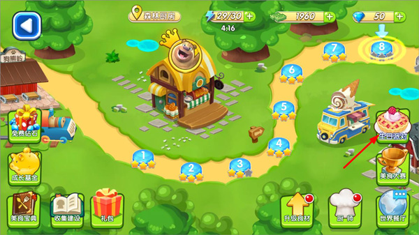 1. 开启《熊出没美食餐厅》游戏,进入游戏主界面,玩家能够进行建设厨房的收集、查看美食宝典、升级食材等操作,接着点击生日派对。