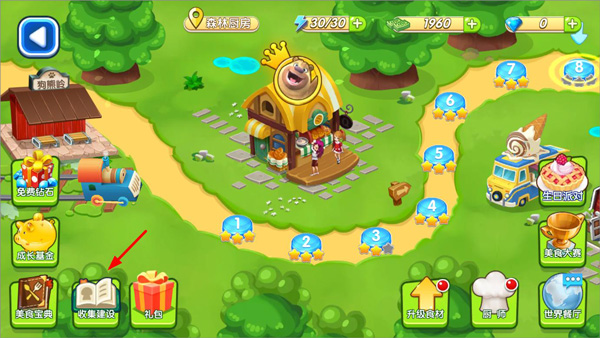 1、玩家通过不断升级通关获得厨房碎片,点击主页面的收集建设;