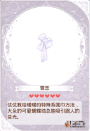 白紫色调的围巾,有着别具一格的系法。围巾被巧妙地系成一个大大的蝴蝶结,少女的可爱气息瞬间凸显。那纯粹洁白的气息,仿佛有一种无形的力量,不知是谁在禁锢着谁。“这可是优优教给暖暖的特别系围巾方式哦,那大大的可爱蝴蝶结,总能引得路人纷纷侧目。”