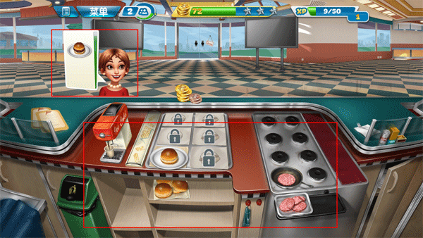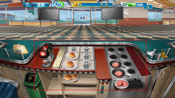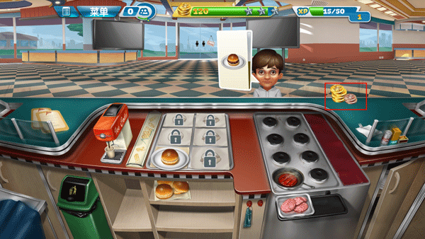 1、打开游戏,进入关卡1。根据客人的口味,选择汉堡包,然后将牛排放入到汉堡包里面,最后将食物递给顾客。顾客吃到自己想要的食物,就会给与金币和小费在桌子上,你需要点击桌子上的货币来获取。