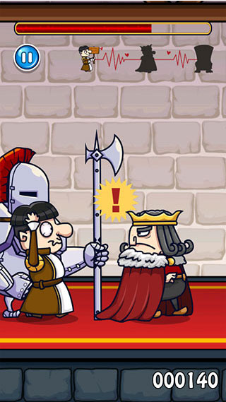 2、当角色靠近国王时,持续按住屏幕,待上方的蓄力条完全填满,角色便会挥刀刺向国王。不过,在蓄力的过程中,要是察觉到国王有回头的举动,手指需立刻从屏幕上移开,避免被抓。