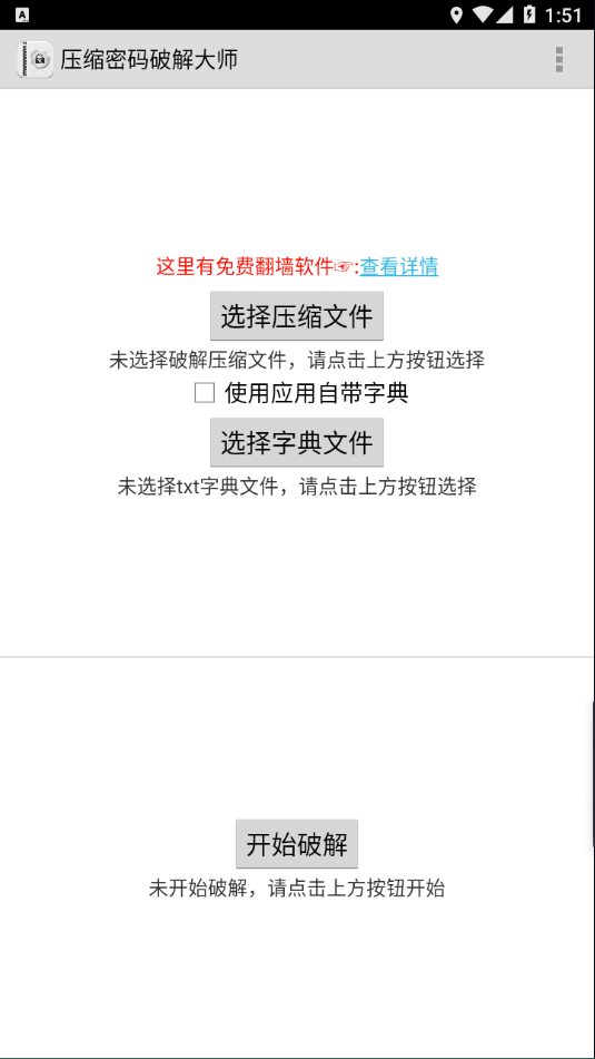 二、点击“字典暴力”,选择所需的压缩文件,并决定是否使用应用自带字典。