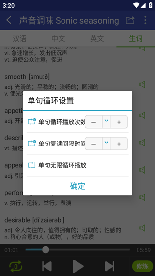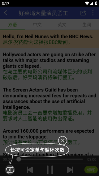 4、点击进入新闻详情页面,英语朗读会即刻自动播放。若长按页面左下角,便可对单句循环的次数进行设定。