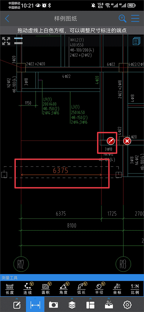 2、进入后将图纸放大,并在下方功能中的测量工具内点击长度