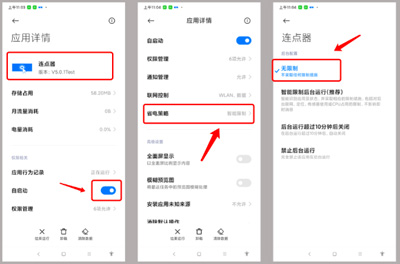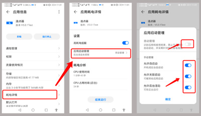 在应用管理中,进入自动化助手,找到耗电详情,再点击应用启动管理,关闭自动管理后,将“允许自启动、允许关联启动、允许后台启动”这三个选项全部开启。