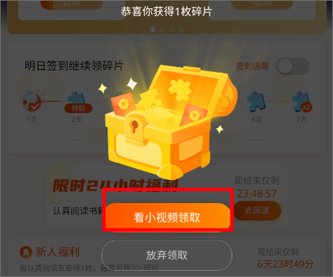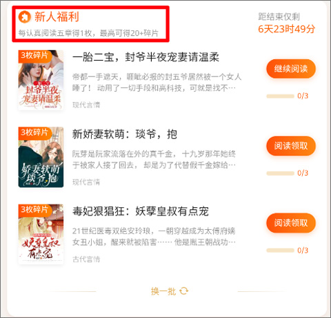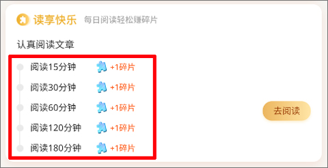 每日于app内阅读小说,阅读时长达标就能获取对应的碎片奖励。奖励以阶梯形式递增,每天阅读时长满3小时,可拿到最高阅读奖励,共计5块碎片。