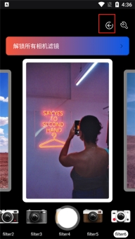 1、打开软件,软件内有大量胶卷滤镜供用户选择。你只要挑选自己心仪的滤镜,再点击中间的拍照按钮就可以了。