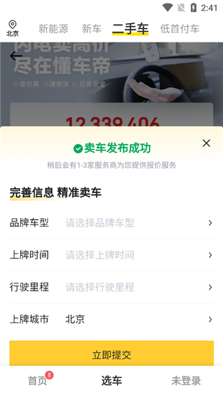 3、填入手机号以及验证码,然后点击“高价卖车”。