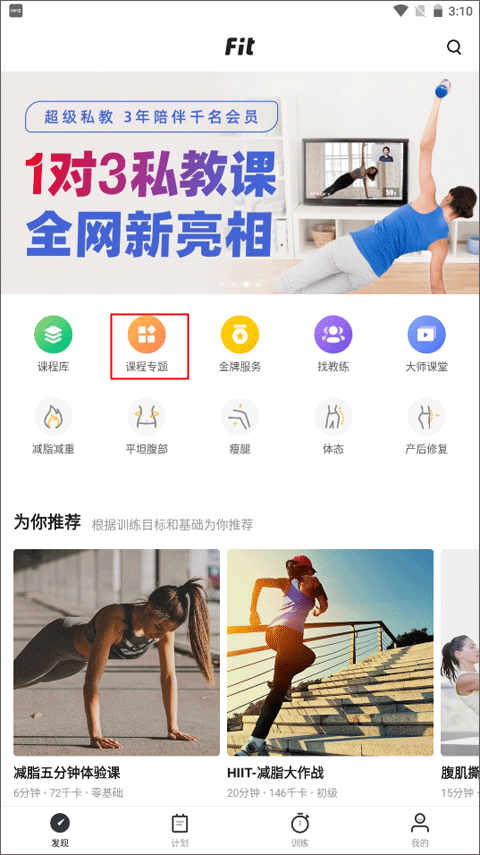 1、打开软件并进入主界面【发现】,你可以在这个界面看到课程库、课程专题、金牌服务、找教练等功能,点击“课程专题”。