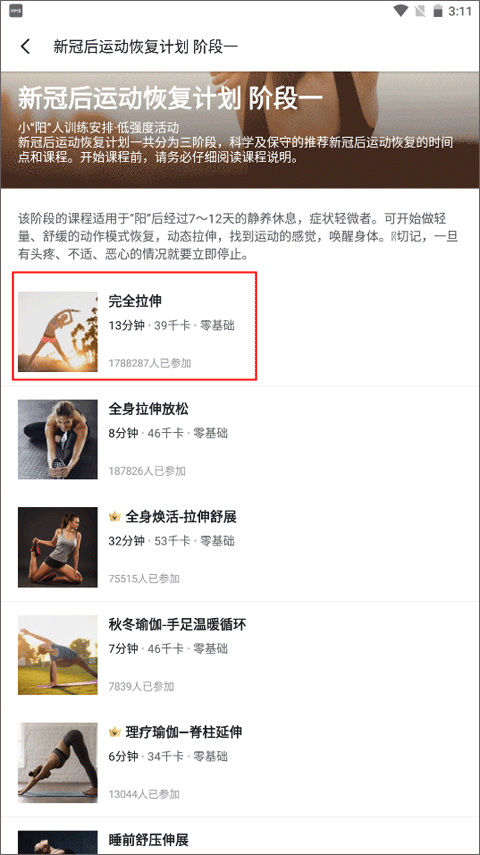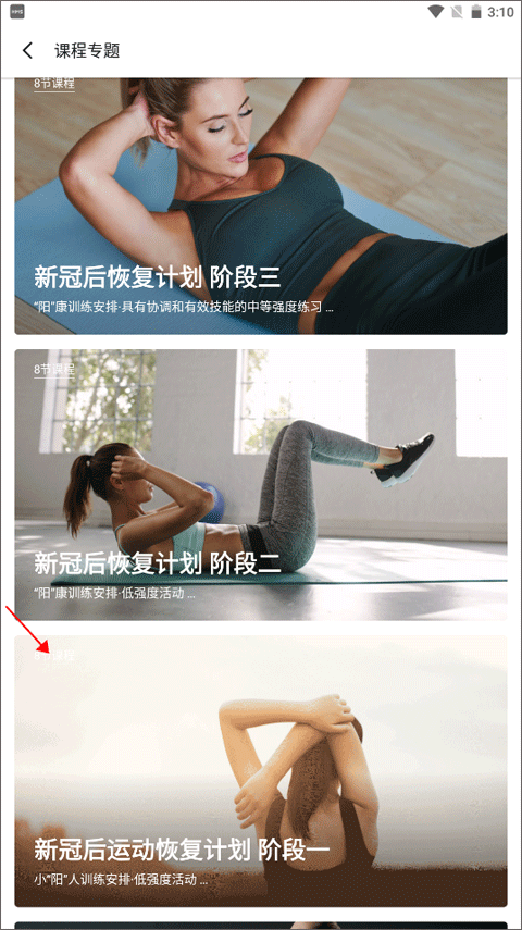 2、进入课程专题界面,你会看到最新的新冠后恢复计划三个阶段,先从第一个阶段开始训练。