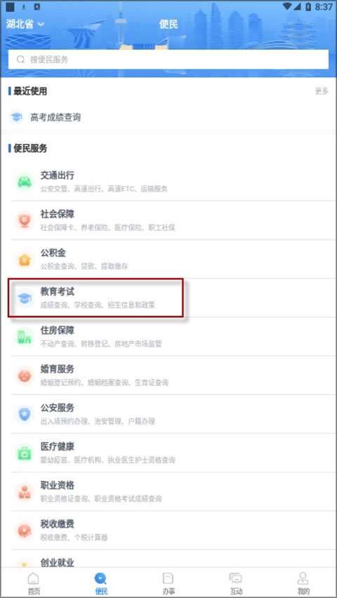 2. 点击下方功能栏里的便民功能,在其中找到教育考试这一功能类别。
