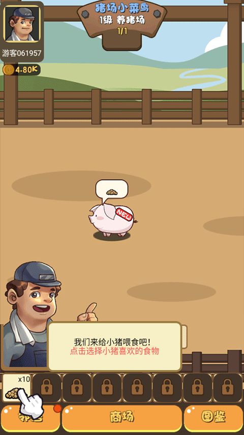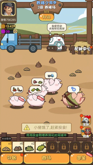 游戏玩法:整体而言,该游戏十分简易,可通过购买猪仔或者让猪进行交配来获取猪仔,接着给猪仔喂食,并清理猪仔产生的垃圾,经过一段时间后,这些猪仔要么能够拿去贩卖,要么成长为可用于交配的成年猪,如此循环往复。