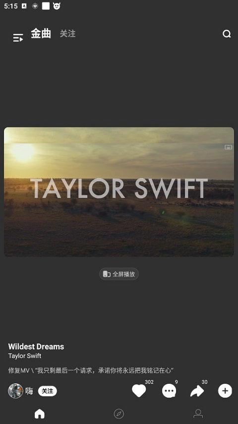 1、打开“音悦台”app,找到你所点播的歌曲,参照图示,点击“全屏播放”。