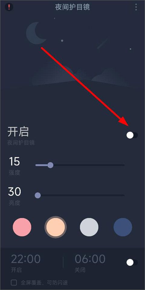 1. 打开“夜间护目镜”应用程序,进入主界面,点击主界面右侧的开启按钮,就能开启夜间护目镜。此外,还能够对其强度、亮度,以及夜间护目镜的开启时间与关闭时间进行调节。