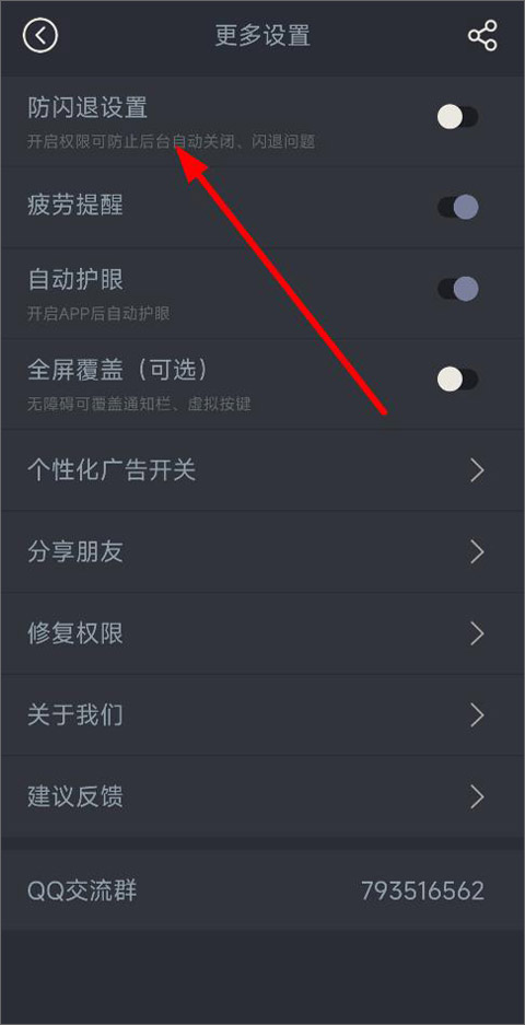 3、进入更多设置页面,用户能够开启权限设置中的防闪退、疲劳提醒、自动护眼以及全屏覆盖等功能,完成设置后退出,相关设置便会自动保存。