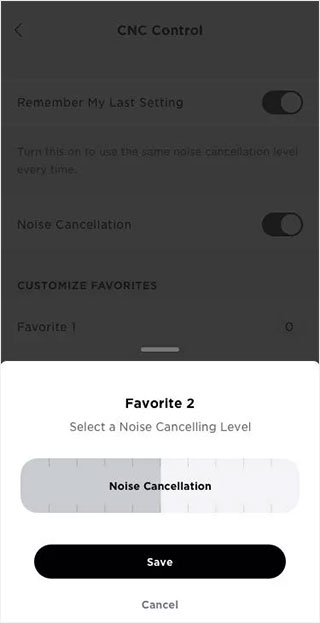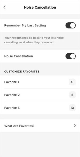 在Bose Music应用程序里,利用您产品屏幕上的“Noise Cancellation(噪声消除)”滑块,把噪声消除程度从最低(滑块左侧)调节至最高(滑块右侧)。