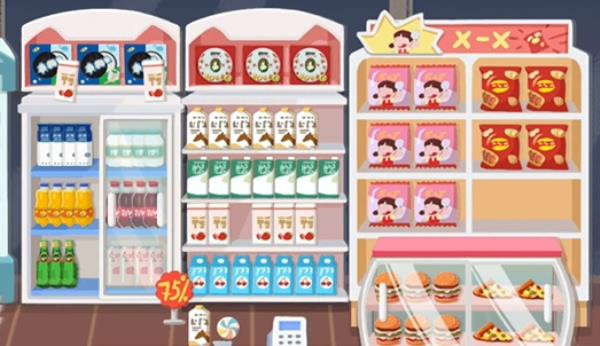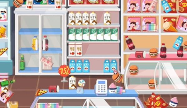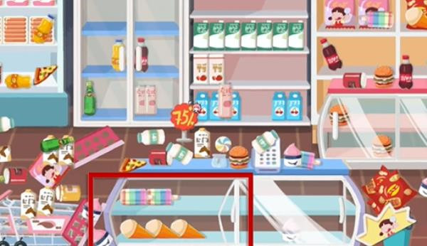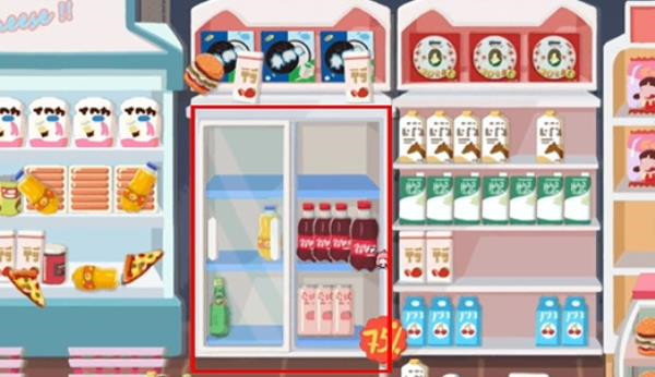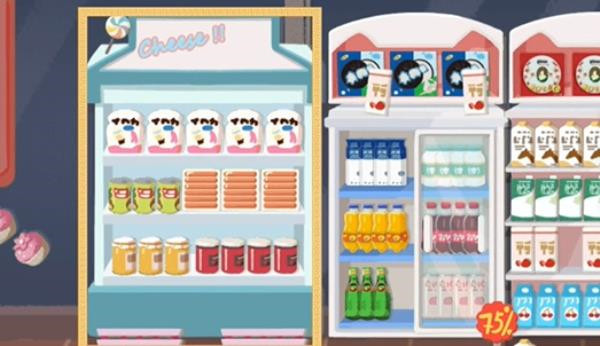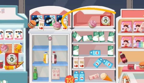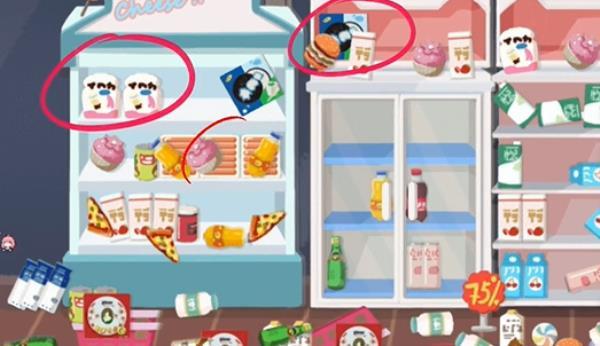 2、第二步:接下来我们留意最左边的冰箱以及旁边柜子上已摆放好的零食,照着把同样的零食摆放好就行。