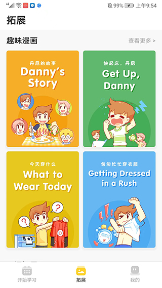 3、进入拓展界面,可看到包括趣味漫画,我们点击【丹尼的故事】,