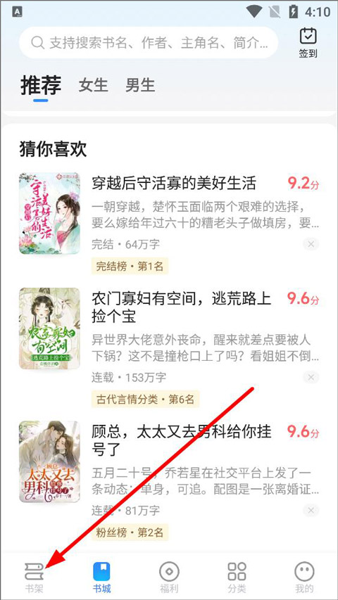 1. 点开星空免费小说app,登录后进入书城界面。在书城里,用户能够查看推荐书籍、男生专区书籍、女生专区书籍,还能通过搜索找到想看的书,之后点击书架。