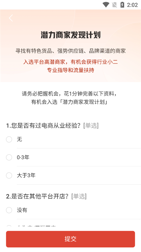 3、进入平台后,点击完善下面的资料,如有无从业经营、是否在其他平台开店、年经营规模、前期投入人数等等问题。最后点击提交即可;