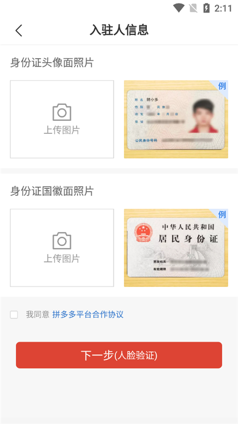 6、长传身份证正反面,之后进行人脸认证,然后等待审核即可;