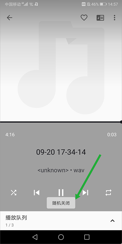 3、这时,用户若看到【随机关闭】字样(如下面绿色箭头所指),便意味着随机播放已关闭,接下来将按顺序播放。