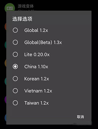 需注意,“游戏变体”至关重要。若要玩《和平精英》,需选择“China 1.10x”;若是国际版,则选择“Global 1.2x” 。