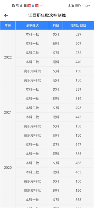 4、不仅如此,还能够点击主页面的【历年此批】,在该板块能够查看江西历年的相应控制线,例如本科一批文科分数线为529 。